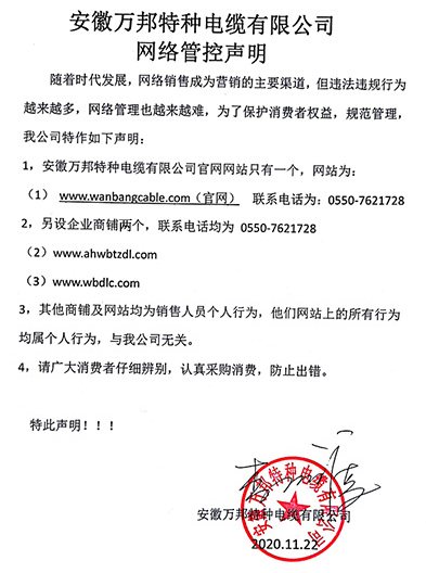 鄭重聲明:安徽萬邦特種電纜有限公司官方網站為:www_wanbangcable_com.cxjmzj.com,除此之外無任何子網站或合作網站,其余均為假冒偽劣。電話:0550-7621728 13485756353 地 址:安徽省天長市滁州高新技術產業開發區經四路29號
